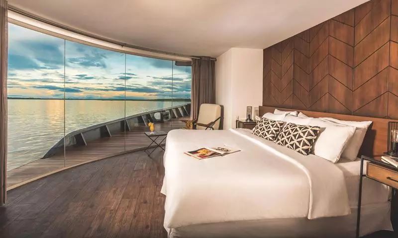 El crucero Zafiro te lleva a explorar la biodiversidad del Amazonas con todas las comodidades de un hotel cinco estrellas. Las suites, con amplios ventanales, permiten disfrutar de vistas panorámicas del río y la selva, hogar de más de 400 especies de aves, 2,500 tipos de mariposas y animales emblemáticos como el jaguar, el manatí amazónico y los monos aulladores.
