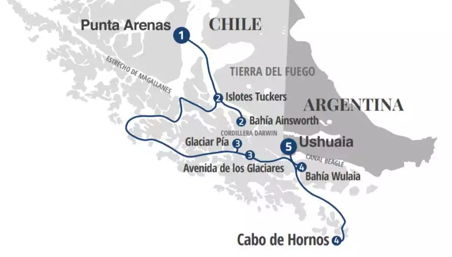 from Punta Arenas (Chile) to Ushuaia (Argentina), we will discover the wild beauty of